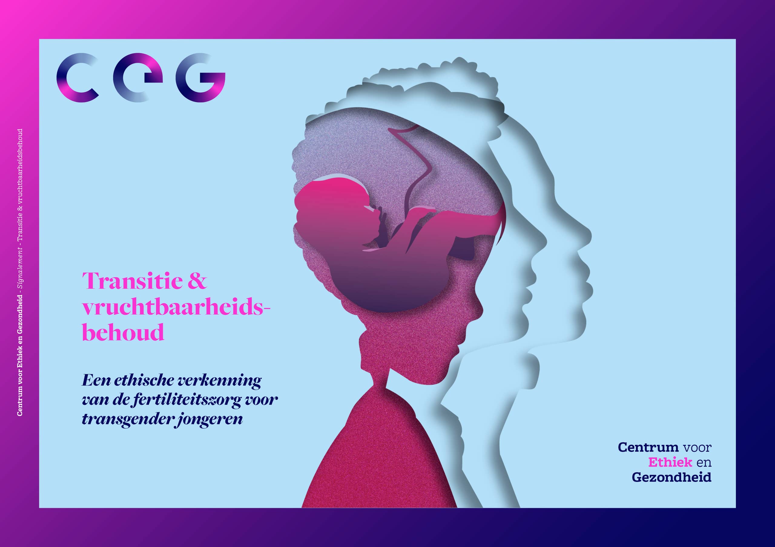 In dit signalement brengt het CEG de ethische en juridische vraagstukken in de fertiliteitszorg voor transgender personen in kaart. Het Centrum voor Ethiek en Gezondheid stelt dat de transgenderzorg nog niet goed omgaat met de kinderwens van transgender personen – vooral als de kinderwens er nog niet zo duidelijk is.