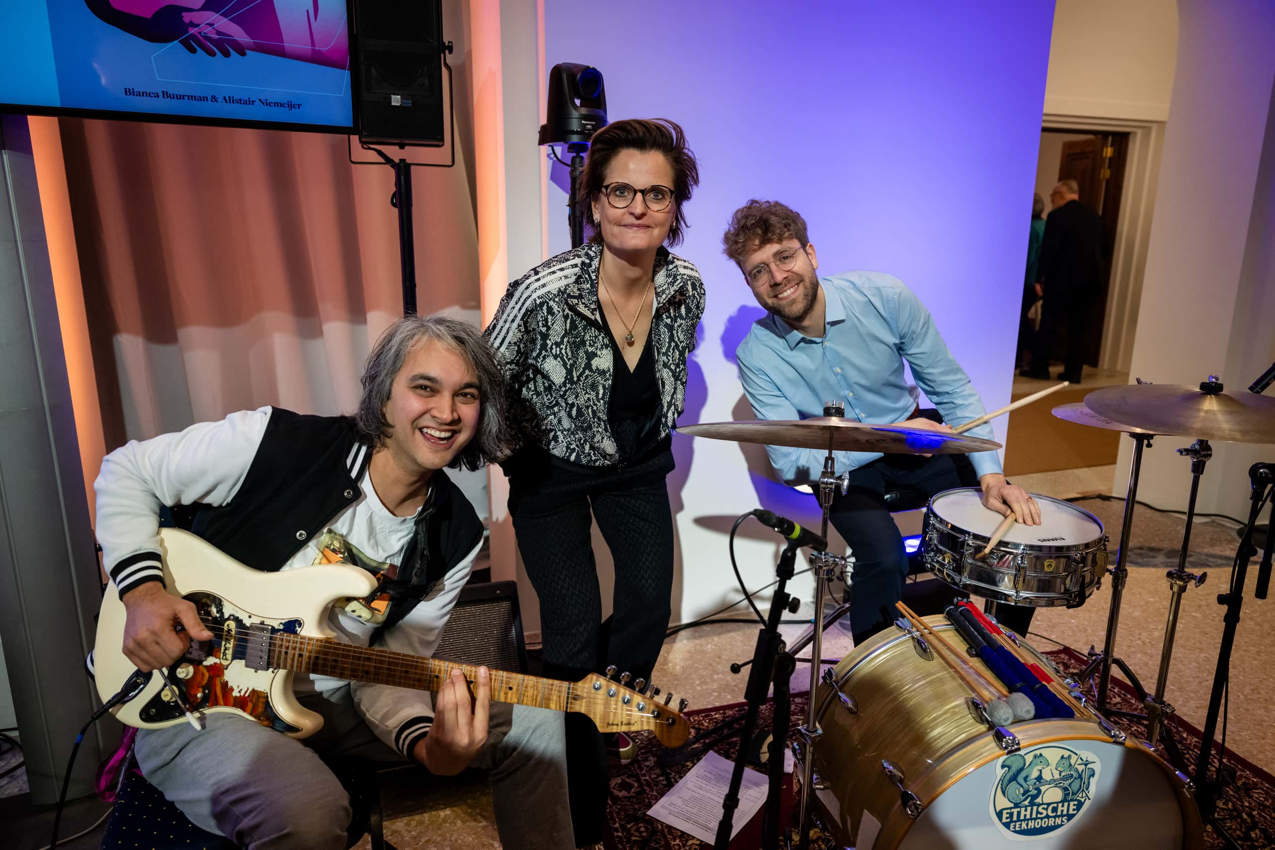 Bij binnenkomst deelt de gastvrouw kaartjes uit ter grootte van een visitekaartje. Aan iedere gast een. Het kaartje is inwisselbaar voor een kopje koffie óf een toiletbezoek. Sommige bezoekers lopen morrend naar de zaal. Er wordt gediscussieerd. Dilemma’s maken iets in ons los. In de zaal klinken de opzwepende tonen van de Ethische Eekhoorns, de band bestaande uit Virgil Rerimassie op gitaar en Richie Struck op de drums. Ze omlijsten de sprekers met muzikale intro’s.
