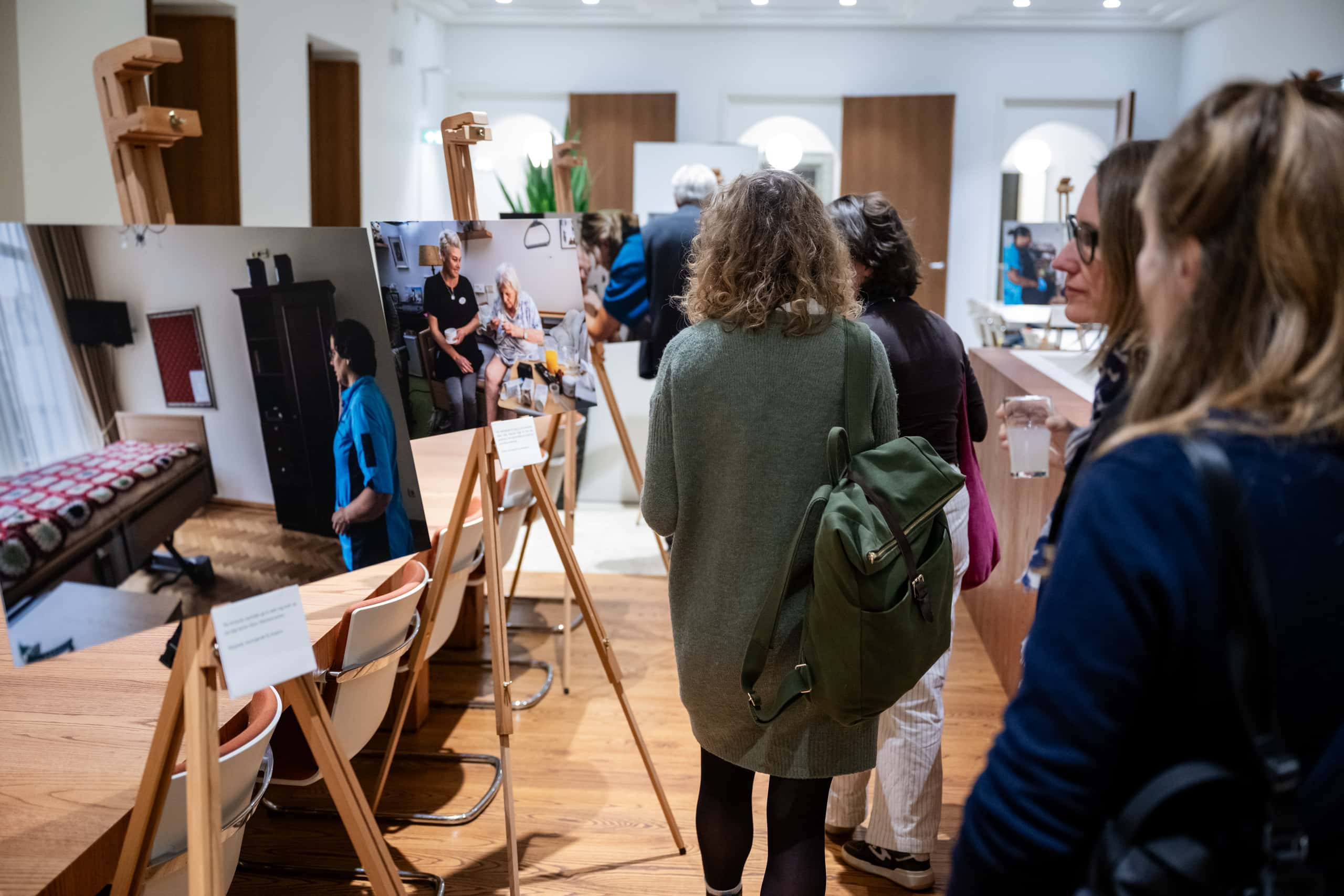 Na afloop bekijkt het publiek de fototentoonstelling Onzichtbaar maar onmisbaar van Marieke van Wieringen. Er wordt namelijk veel geschreven over zorgprofessionals, maar zonder afbeeldingen uit de praktijk. In de foto’s staan verzorgenden en hun vak centraal. Het is dan ook een ode aan de zorgprofessional. Sommige foto’s raken het ongemak bij de kijker. Zoals de blik van een man die boven de deken uitsteekt terwijl hij wordt verzorgd. Als kijker zien we de afhankelijkheid van de mens. Ook dit is zorg. De foto’s zijn uitgegeven als fotoboek dat hier verkrijgbaar is.